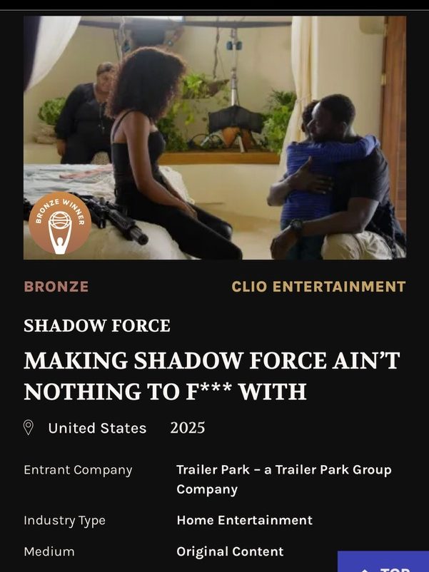 On Thursday, Nov. 13th, I won 2 Bronze Clio awards for my color correction work on two behind-the-scenes featurettes about the Lionsgate film Shadow Force. It stars Method Man, Omar Sy, and Kerry Washington. What a nice way to be recognized!